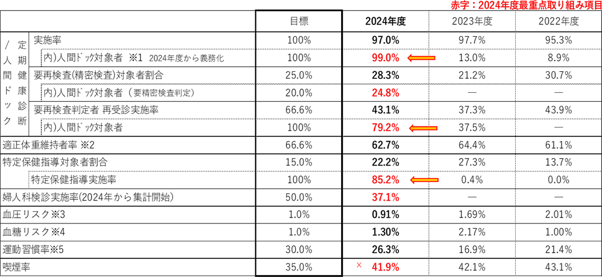 生活習慣病対策への取り組みとして成人病リスクが高まる40歳以上の全社員とその家族の健康維持・増進を図る為、扶養配偶者も含め「全額会社負担」「受診日は出社日扱い」とする人間ドック受診サポート策を2024年度より実施しました。